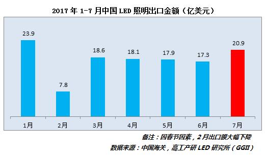 ?? GGII發布的《2016-2017年中國LED照明出口月度監測報告》數據顯示,2017年7月中國LED照明出口總額達20.9億美元,較上月增長21%。總體來看,自前面3-6月份出口市場行情下傾以來算是一大增長的整體態勢。