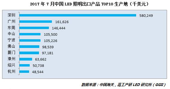 ? 從出口生產地來看,7月份LED照明產品出口生產地主要集中在華南地區和江浙一帶。其中,出口排名前十生產地區總金額約14.6億美元,占比70%。