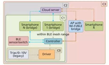 ? 智能手機控制通常可以分為三個層次:C1,C2和C3,在大多數情況下,C0是目前在用的傳統控制方案(圖2)。可以選擇現有的驅動程序添加一個專用控制器,在C0頂部裝上BLE傳感器或開關,這樣可以直接控制,無需云服務器。在C1模式下,多個智能手機控制可以讓用戶與其他人一起分享照明控制。