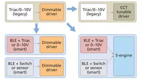 ? 類似地,相同的技術可以應用于開關和傳感器上,將大多數現有組件轉換為智能組件,同時保留其原有設計中的一些組件。使用向后兼容的智能驅動程序,現有的控制器可以匹配新的CCT可調驅動程序。此外,LED模塊、驅動器和控制器可以合并成單板(或稱為S引擎),以將成本降低到可接受的水平。