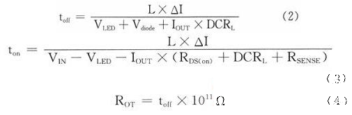 ? R1=200 mV/ILED=200 mV/350 mA≈0.56?Ω (1)式中,ILED為LED燈串電流。圖4中的C5采用官方數(shù)據(jù)手冊推薦的取值。電感L1及ROT由式(2)~(4)得到。式中,toff、ton、△I、RDS(oN)的取值參考數(shù)據(jù)手冊;VIN在此處取為24 V,DCRL為電感電阻,此處取為0?Ω。