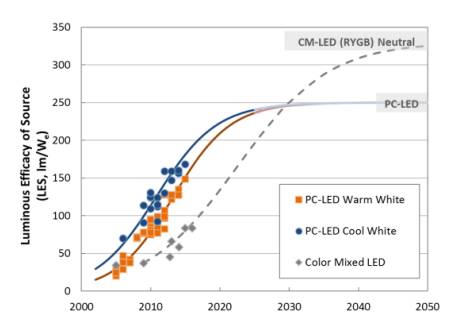 2017年研究課題文件顯示,冷白光和暖白色熒光體轉換的LED的功效差距正在縮小。美國能源部表示,到2020年,典型的218lm/W冷白效能在封裝層面的差異將為10 lm/W。到2025年,該機構預計冷白色效能會達到240 lm/W,與暖白光LED只有3 lm/W的差距。