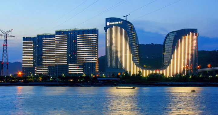整個海滄灣沿線夜景工程以廈門中心、泰地海西中心、融信海上城三座大型城市綜合體為主要媒體展示節點,沿岸辦公住宅樓立面動態燈具相呼應,表達“山水相依”的動畫主題,形成7公里長海滄灣沿海景觀帶連綿不絕、氣勢磅礴,山、海、湖、島、城渾然一體的海滄夜景感受。建筑山墻的彩色投光通過海滄大橋動態聯動將海滄區與廈門本島緊密聯系在一起。